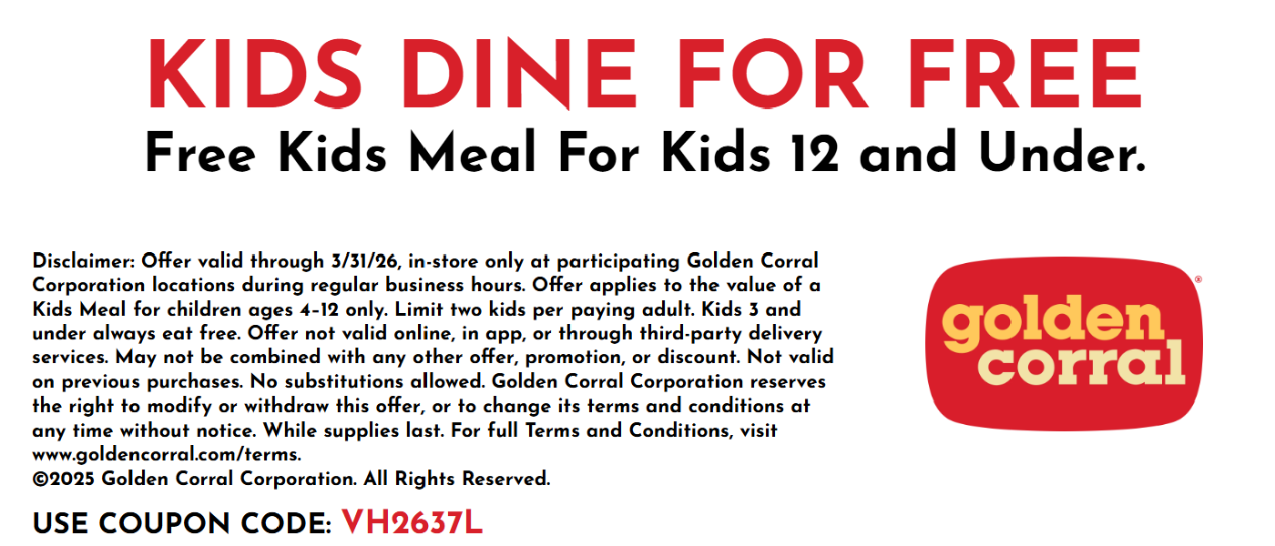 Disclaimer: Offer valid through 3/31/26, in-store only at participating Golden Corral Corporation locations during regular business hours. Offer applies to the value of a Kids Meal for children ages 4–12 only. Limit two kids per paying adult. Kids 3 and under always eat free. Offer not valid online, in app, or through third-party delivery services. May not be combined with any other offer, promotion, or discount. Not valid on previous purchases. No substitutions allowed. Golden Corral Corporation reserves the right to modify or withdraw this offer, or to change its terms and conditions at any time without notice. While supplies last. For full Terms and Conditions, visit www.goldencorral.com/terms.