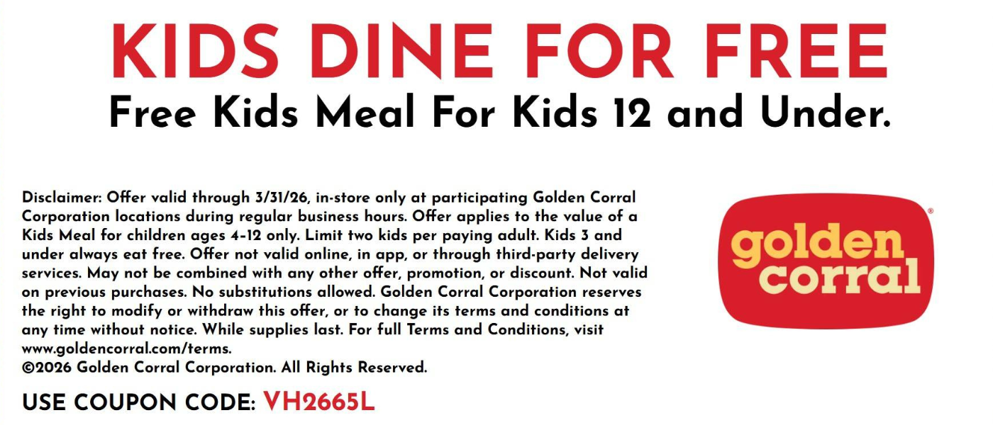 Disclaimer: Offer valid through 3/31/26, in-store only at participating Golden Corral Corporation locations during regular business hours. Offer applies to the value of a Kids Meal for children ages 4–12 only. Limit two kids per paying adult. Kids 3 and under always eat free. Offer not valid online, in app, or through third-party delivery services. May not be combined with any other offer, promotion, or discount. Not valid on previous purchases. No substitutions allowed. Golden Corral Corporation reserves the right to modify or withdraw this offer, or to change its terms and conditions at any time without notice. While supplies last. For full Terms and Conditions, visit www.goldencorral.com/terms.