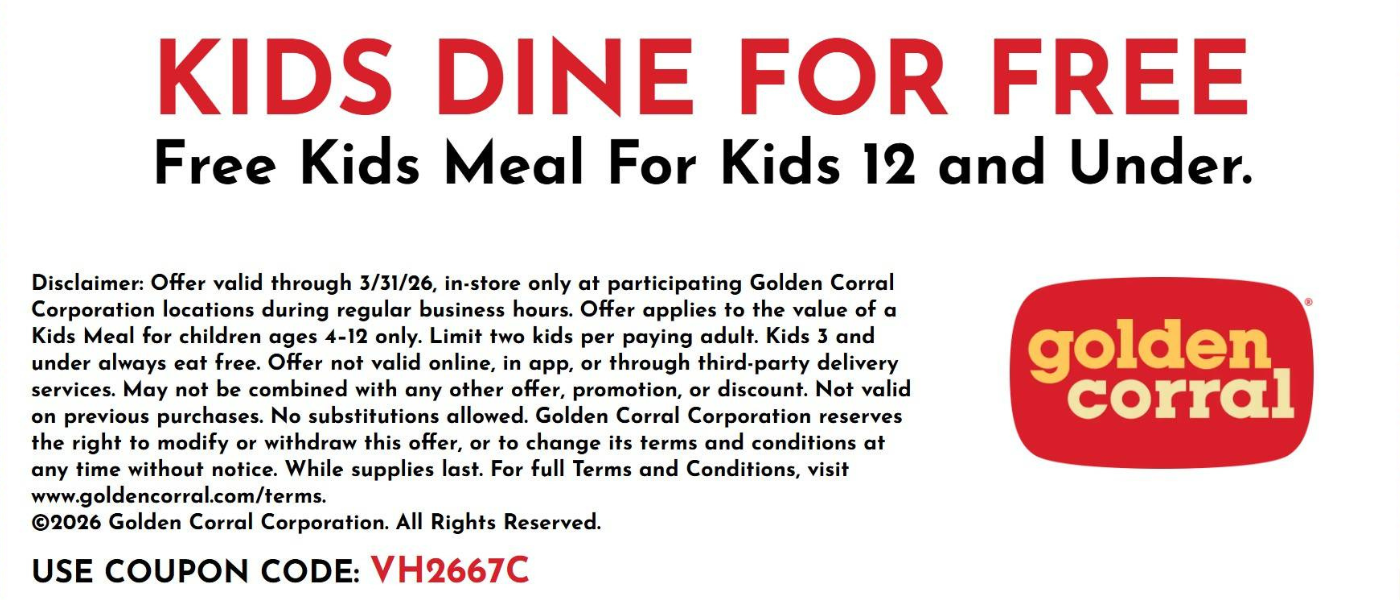 Disclaimer: Offer valid through 3/31/26, in-store only at participating Golden Corral Corporation locations during regular business hours. Offer applies to the value of a Kids Meal for children ages 4–12 only. Limit two kids per paying adult. Kids 3 and under always eat free. Offer not valid online, in app, or through third-party delivery services. May not be combined with any other offer, promotion, or discount. Not valid on previous purchases. No substitutions allowed. Golden Corral Corporation reserves the right to modify or withdraw this offer, or to change its terms and conditions at any time without notice. While supplies last. For full Terms and Conditions, visit www.goldencorral.com/terms.
