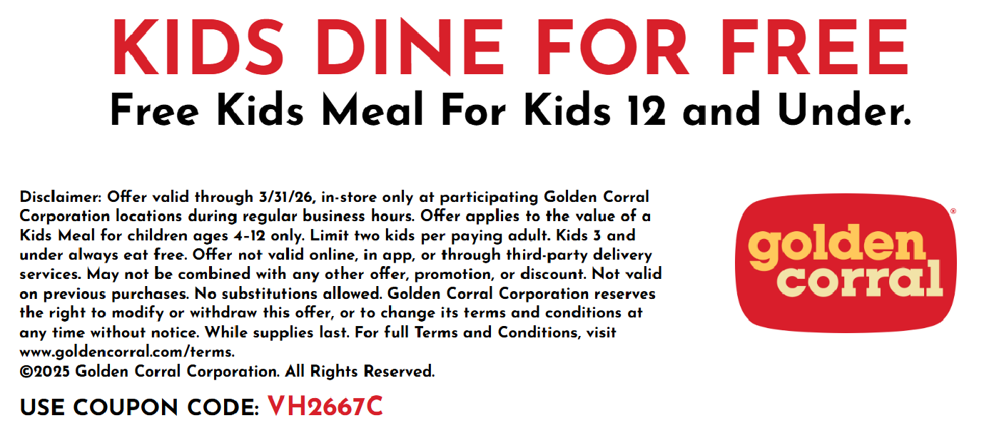 Disclaimer: Offer valid through 3/31/26, in-store only at participating Golden Corral Corporation locations during regular business hours. Offer applies to the value of a Kids Meal for children ages 4–12 only. Limit two kids per paying adult. Kids 3 and under always eat free. Offer not valid online, in app, or through third-party delivery services. May not be combined with any other offer, promotion, or discount. Not valid on previous purchases. No substitutions allowed. Golden Corral Corporation reserves the right to modify or withdraw this offer, or to change its terms and conditions at any time without notice. While supplies last. For full Terms and Conditions, visit www.goldencorral.com/terms.