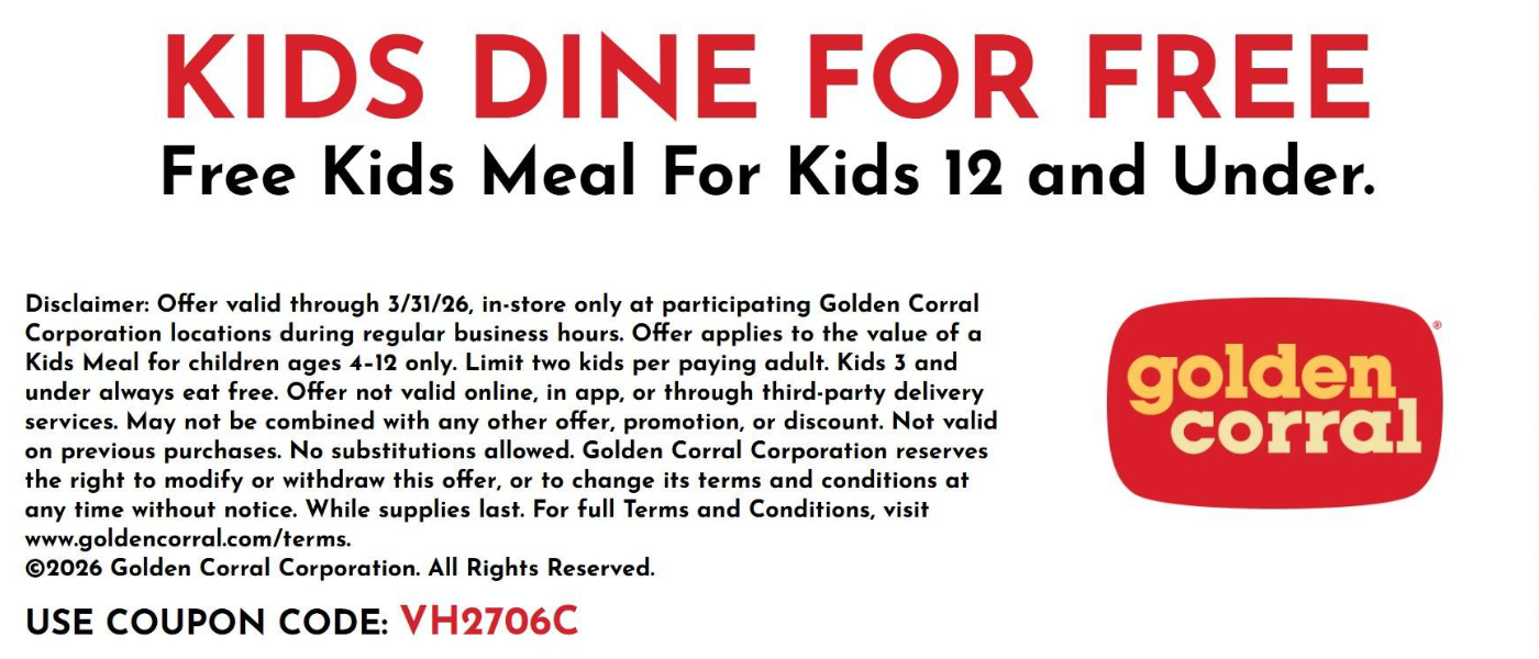 Disclaimer: Offer valid through 3/31/26, in-store only at participating Golden Corral Corporation locations during regular business hours. Offer applies to the value of a Kids Meal for children ages 4–12 only. Limit two kids per paying adult. Kids 3 and under always eat free. Offer not valid online, in app, or through third-party delivery services. May not be combined with any other offer, promotion, or discount. Not valid on previous purchases. No substitutions allowed. Golden Corral Corporation reserves the right to modify or withdraw this offer, or to change its terms and conditions at any time without notice. While supplies last. For full Terms and Conditions, visit www.goldencorral.com/terms.