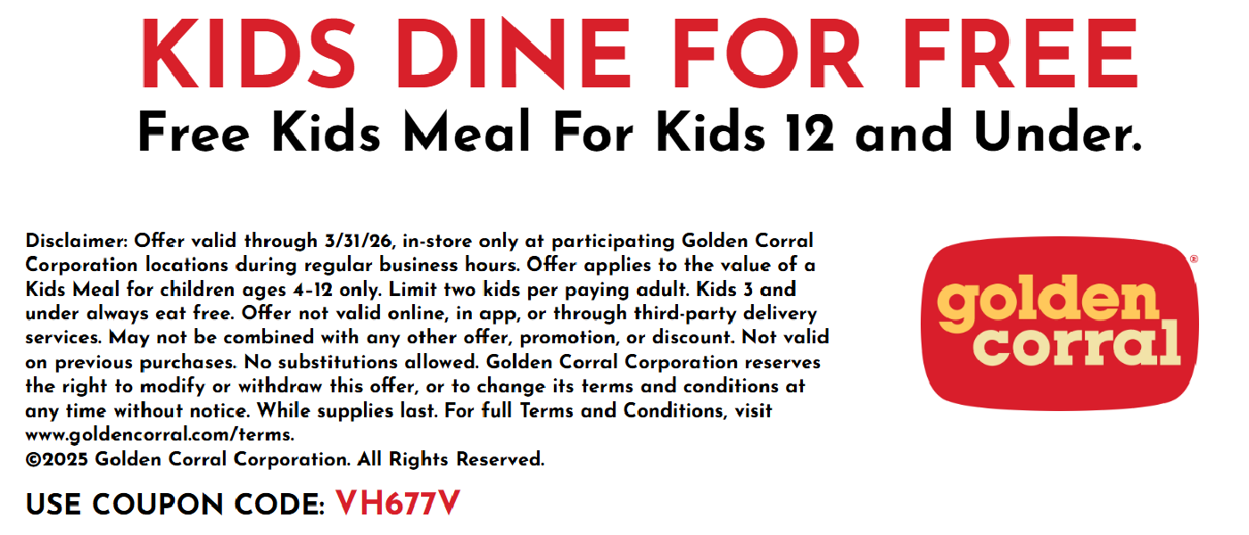 Disclaimer: Offer valid through 3/31/26, in-store only at participating Golden Corral Corporation locations during regular business hours. Offer applies to the value of a Kids Meal for children ages 4–12 only. Limit two kids per paying adult. Kids 3 and under always eat free. Offer not valid online, in app, or through third-party delivery services. May not be combined with any other offer, promotion, or discount. Not valid on previous purchases. No substitutions allowed. Golden Corral Corporation reserves the right to modify or withdraw this offer, or to change its terms and conditions at any time without notice. While supplies last. For full Terms and Conditions, visit www.goldencorral.com/terms.