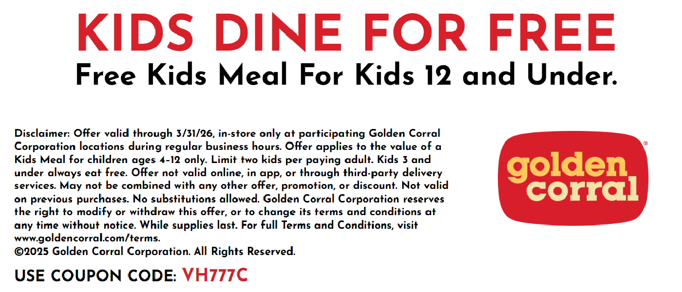 Disclaimer: Offer valid through 3/31/26, in-store only at participating Golden Corral Corporation locations during regular business hours. Offer applies to the value of a Kids Meal for children ages 4–12 only. Limit two kids per paying adult. Kids 3 and under always eat free. Offer not valid online, in app, or through third-party delivery services. May not be combined with any other offer, promotion, or discount. Not valid on previous purchases. No substitutions allowed. Golden Corral Corporation reserves the right to modify or withdraw this offer, or to change its terms and conditions at any time without notice. While supplies last. For full Terms and Conditions, visit www.goldencorral.com/terms.