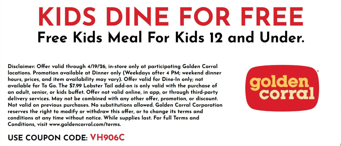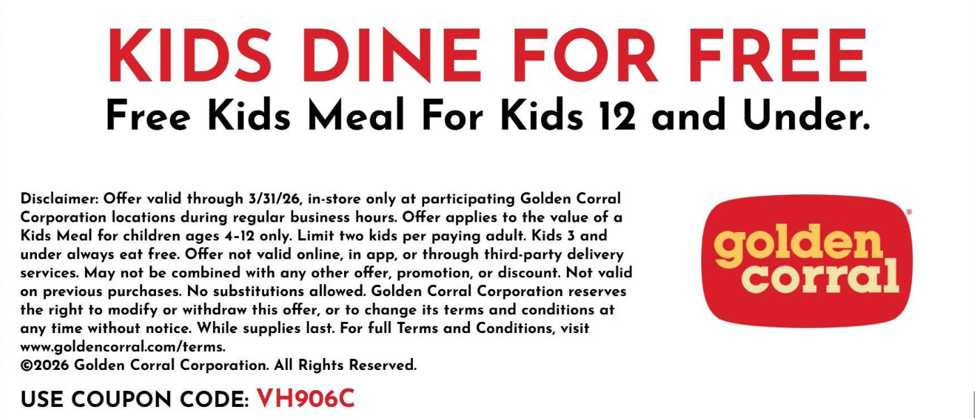 Disclaimer: Offer valid through 3/31/26, in-store only at participating Golden Corral Corporation locations during regular business hours. Offer applies to the value of a Kids Meal for children ages 4–12 only. Limit two kids per paying adult. Kids 3 and under always eat free. Offer not valid online, in app, or through third-party delivery services. May not be combined with any other offer, promotion, or discount. Not valid on previous purchases. No substitutions allowed. Golden Corral Corporation reserves the right to modify or withdraw this offer, or to change its terms and conditions at any time without notice. While supplies last. For full Terms and Conditions, visit www.goldencorral.com/terms.