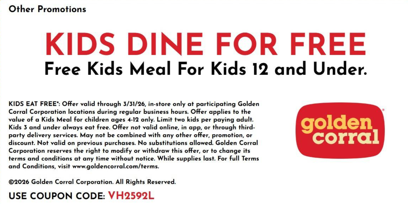 KIDS EAT FREE*: Offer valid through 3/31/26, in-store only at participating Golden Corral Corporation locations during regular business hours. Offer applies to the value of a Kids Meal for children ages 4-12 only. Limit two kids per paying adult. Kids 3 and under always eat free. Offer not valid online, in app, or through third-party delivery services. May not be combined with any other offer, promotion, or discount. Not valid on previous purchases. No substitutions allowed. Golden Corral Corporation reserves the right to modify or withdraw this offer, or to change its terms and conditions at any time without notice. While supplies last. For full Terms and Conditions, visit www.goldencorral.com/terms.