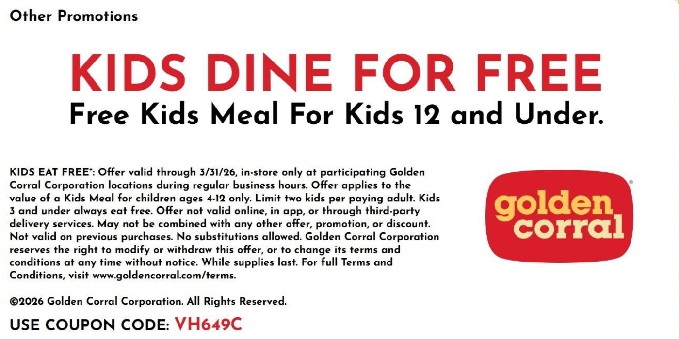 KIDS EAT FREE*: Offer valid through 3/31/26, in-store only at participating Golden Corral Corporation locations during regular business hours. Offer applies to the value of a Kids Meal for children ages 4-12 only. Limit two kids per paying adult. Kids 3 and under always eat free. Offer not valid online, in app, or through third-party delivery services. May not be combined with any other offer, promotion, or discount. Not valid on previous purchases. No substitutions allowed. Golden Corral Corporation reserves the right to modify or withdraw this offer, or to change its terms and conditions at any time without notice. While supplies last. For full Terms and Conditions, visit www.goldencorral.com/terms.
