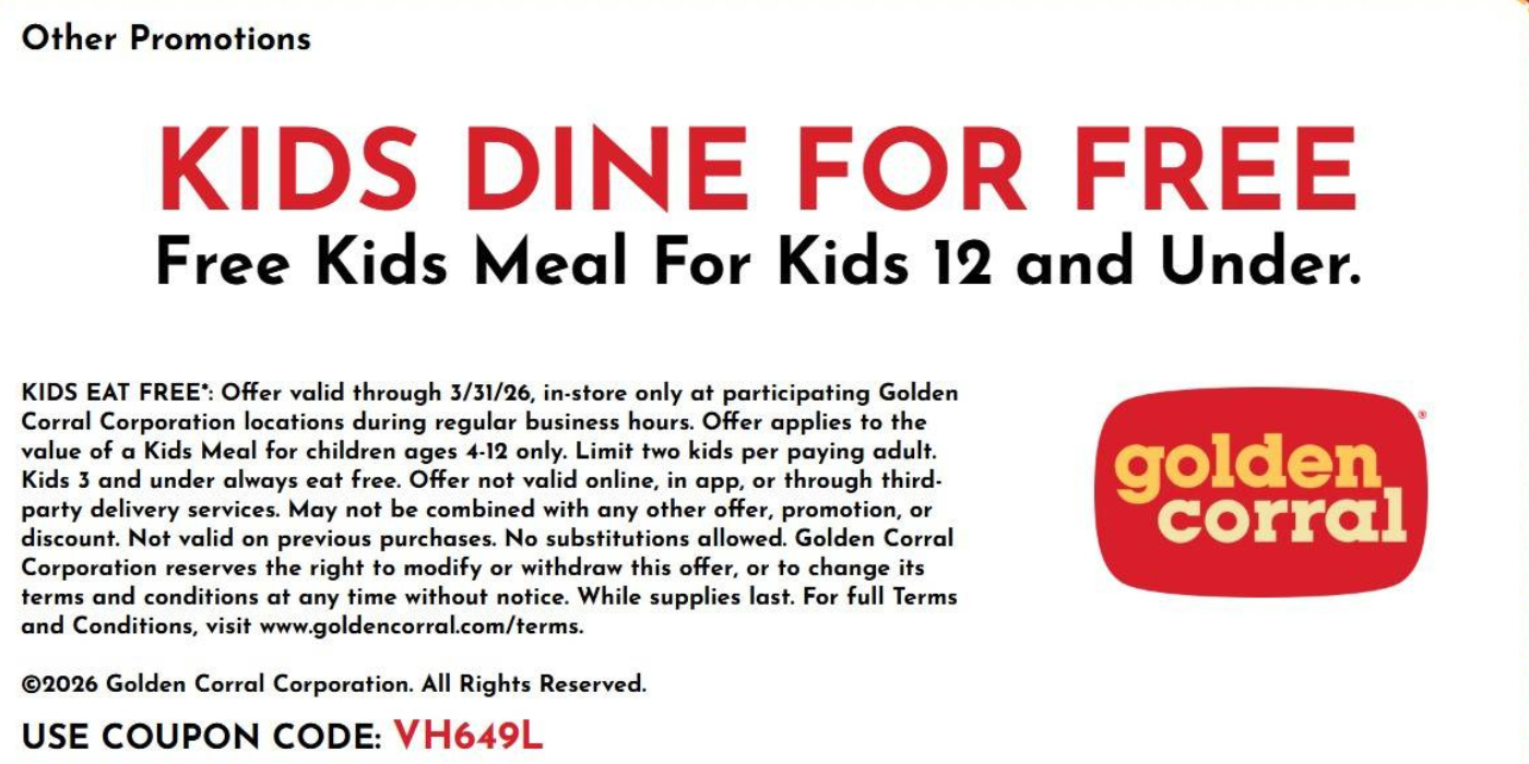 KIDS EAT FREE*: Offer valid through 3/31/26, in-store only at participating Golden Corral Corporation locations during regular business hours. Offer applies to the value of a Kids Meal for children ages 4-12 only. Limit two kids per paying adult. Kids 3 and under always eat free. Offer not valid online, in app, or through third-party delivery services. May not be combined with any other offer, promotion, or discount. Not valid on previous purchases. No substitutions allowed. Golden Corral Corporation reserves the right to modify or withdraw this offer, or to change its terms and conditions at any time without notice. While supplies last. For full Terms and Conditions, visit www.goldencorral.com/terms.